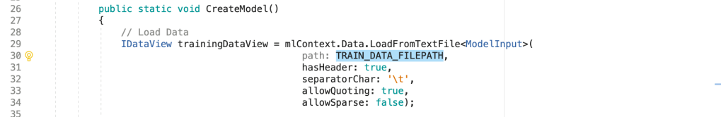 Algunos requisitos que no se mencionan en los videos son los paquetes Nuget. En el proyecto debes agregar la referencias del paquete: Microsoft.ML de preferencia siempre la última versión.