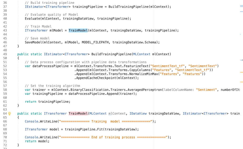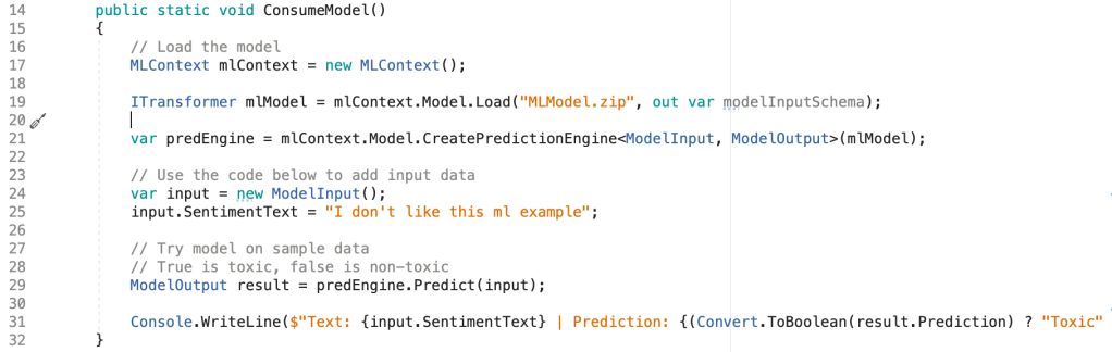Ejecutar. En la mayoría de tutoriales de Machine Learning solo se explica cómo construir un modelo, pero en la práctica la construcción del modelo no nos sirve de nada si no lo podemos usar dentro de una aplicación. Esta es otra de las grandes ventajas de ML.NET, como el modelo está construido dentro de un ambiente de .NET es muy sencillo utilizarlo dentro de una aplicación con pocas lineas de código.