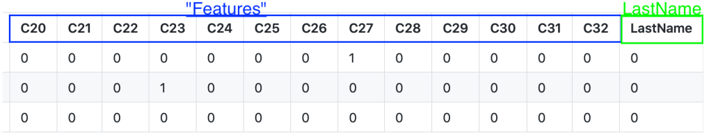 - Cargar los datos desde el archivo .csv generado anteriormente, se define una columna de tipo vector con el nombre ‘Features’ para cargar los valores de las campañas compradas por el cliente (las columnas 0-31 del archivo .csv), se define además una columna «LastName» para cargar el nombre del cliente (la columna 32 del archivo .csv).