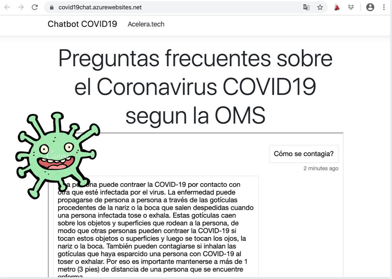 En mi afán de contribuir a frenar la desinformación -y entretenerme mientras pasan estos días de incertidumbre- tomé las preguntas más frecuentes publicadas en el sitio de la OMS y desarrollé un Chatbot para que pueda contestar estas preguntas de la gente.