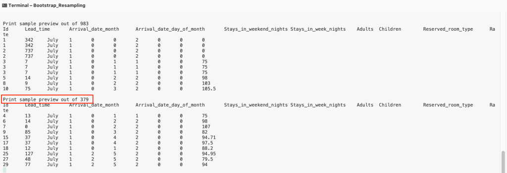 En el segundo ejemplo vemos como crear un dataset «out-of-bag» con los datos no seleccionados en el remuestreo, esta técnica nos sirve para usar este dataset como dataset de pruebas para evaluar un modelo generado, nótese en el resultado que el tamaño de este dataset es mucho menor.